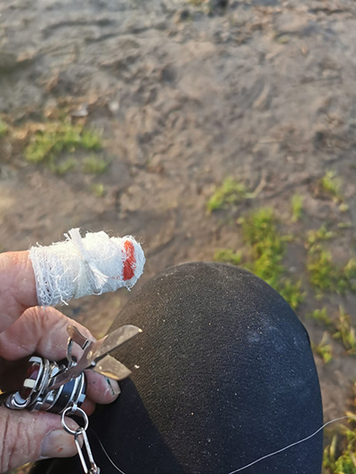 Ну и немного о ножах. Я люблю что бы ножи у меня были как бритва. Достал мул титул, он всегда у меня в куртке на рыбалке. Ну и черканул по пластмассовой ножке, что держит свинцовую головку. Нож очень хорошо наточил. Прорезал пластик, ну и заодно кусочек пальца с ногтем, который попался ему на пути. Да так ловко, я не сразу понял откуда кровь. Ну то не беда, в той же куртке всегда лежит зеленка с бинтом. Залил, замотал, думаю, должно клевать. Ну раз земельку кровью окропил.