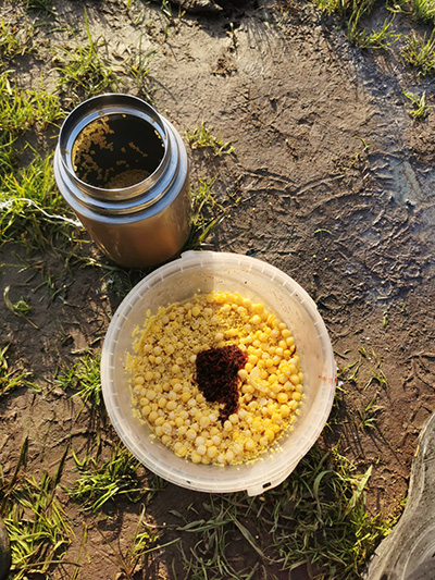 В ведерке оставшийся мотыль, добавил в прикормку.