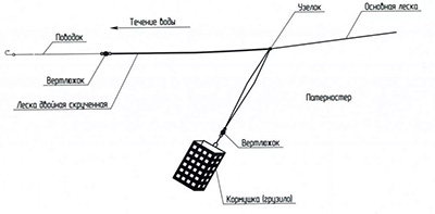 На течении только ей и ловлю. Но в стоячей воде, да и на течении в самом деле, можно и попроще. Хотя, куда проще? А проще, это как на рисунке. Называется, монтаж инлайн. Используется на леща. Но это все условности. Что хочешь, то и лови.