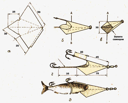 Для изготовления этой снасточки вам понадобится кусок консервной банки, тройник, двойник, два коротких металлических поводка и детская соска. Процесс сборки снасточки представлен на рисунках а, б и в.