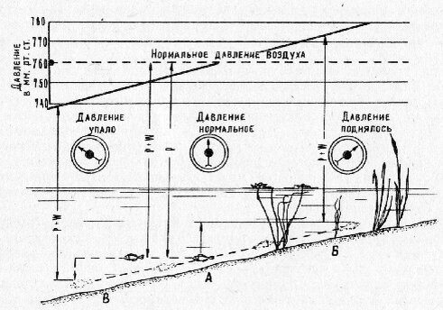 Влияние атмосферного давления: А — рыба держится на обычной глубине; Б - рыба поднялась в верхние слои воды; В — рыба опустилась в глубину