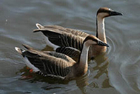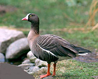 Гусь белолобый (белолобая казарка) — отличается белыми перьями у основания клюва, крупными пятнами на груди и брюшке, длинным хвостом, выступающим из-под маховых перьев, зубцами на краю челюстей, хорошо видимыми даже на закрытом клюве.