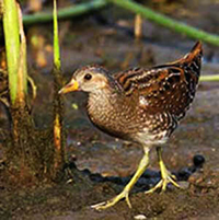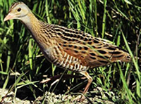Коростель - Тело продолговатое и сжатое с боков, поэтому птица может быстро бегать в высокой густой траве. Спина темно-бурая* с желтоватыми и серыми пятнышками, нижние кроющие крыла и подмышечные перья рыжевато-коричневые, бока желтовато-рыжие, грудь и зоб серовато-желтые с белыми поперечными полосками, осенью охристо-рыжие.