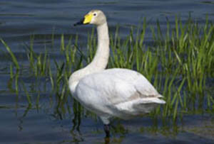 Лебедь- кликун — несколько меньше лебедя-шипуна (7—12 кг), но крыло длиннее, кроме того, уздечка желтого цвета. Длина среднего пальца с когтем превышает 140 мм. Плавая, он держит шею прямо, клюв обращен вперед.