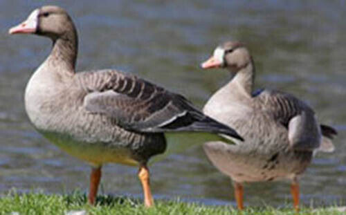 Гусь белолобый (белолобая казарка) — отличается белыми перьями у основания клюва, крупными пятнами на груди и брюшке, длинным хвостом, выступающим из-под маховых перьев, зубцами на краю челюстей, хорошо видимыми даже на закрытом клюве.