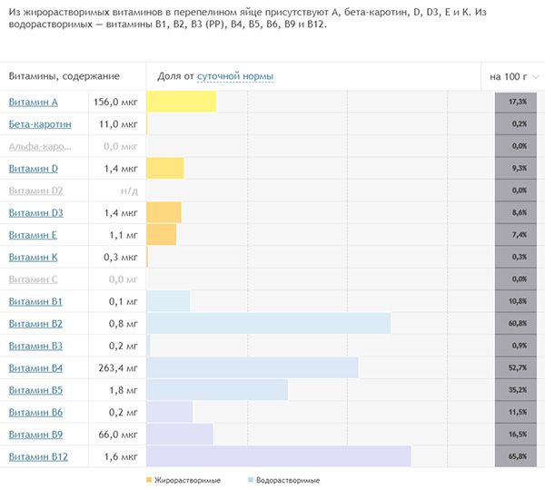 Яйцо перепелиное содержит жирорастворимые витамины (A, бета-каротин, D, D3, E и K), водорастворимые витамины (B1, B2, B3 (PP), B4, B5, B6, B9 и B12)